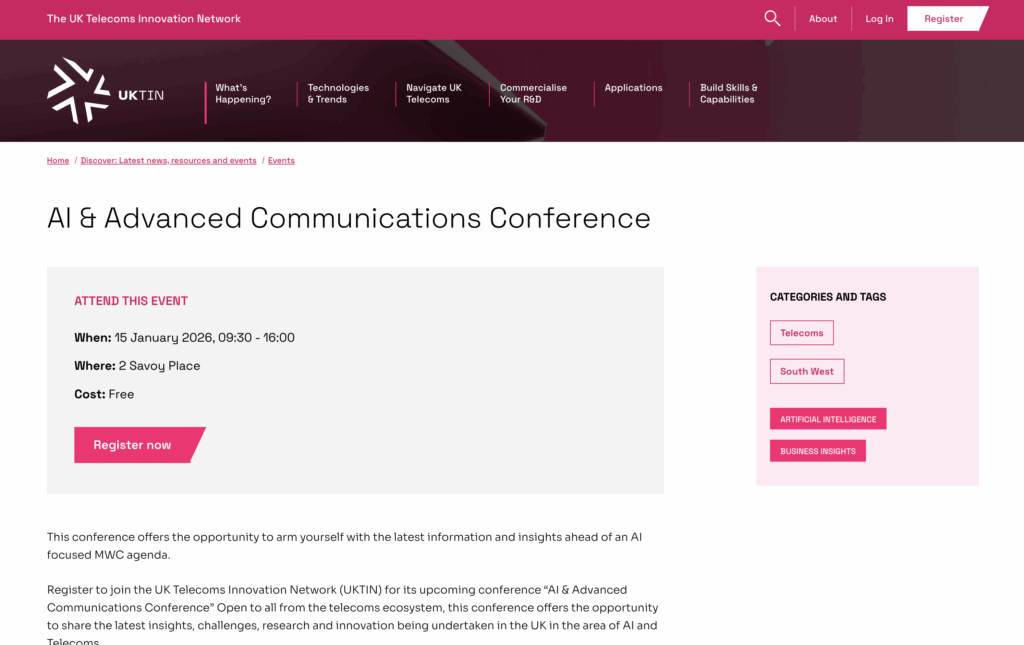 This conference offers the opportunity to arm yourself with the latest information and insights ahead of an AI focused MWC agenda. Register to join the UK Telecoms Innovation Network (UKTIN) for its upcoming conference “AI & Advanced Communications Conference” Open to all from the telecoms ecosystem, this conference offers the opportunity to share the latest